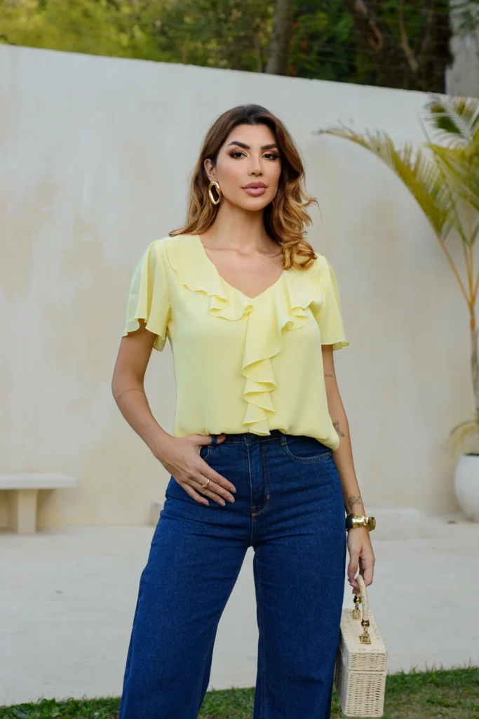 Descubra a combinação ideal de estilo e conforto com nossa blusa em crepe 100% poliéster. Com um caimento fluido e leve, esta peça abraça a silhueta de forma delicada, garantindo o máximo de bem-estar ao longo do dia. O decote V alonga a silhueta, enquanto as manguinhas charmosas e o babado frontal delicado adicionam um toque de romantismo e sofisticação. É a escolha perfeita para criar looks incríveis, seja para o trabalho, um happy hour ou um jantar especial. Vista-se com confiança e sinta-se impecável!