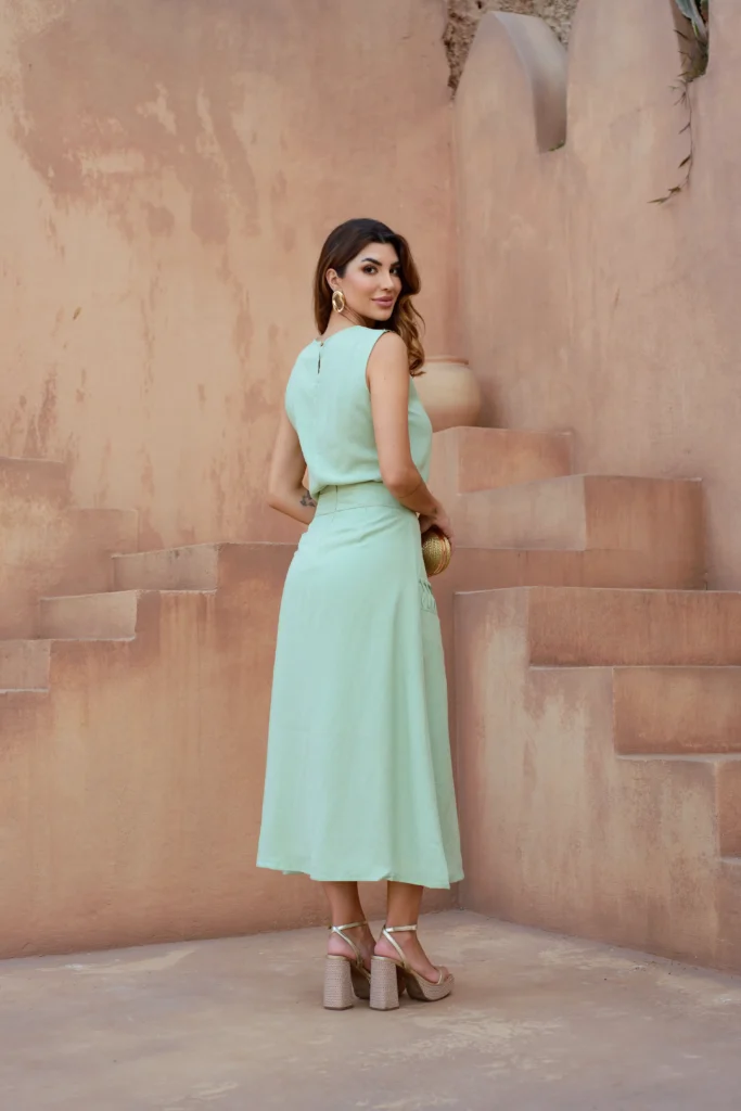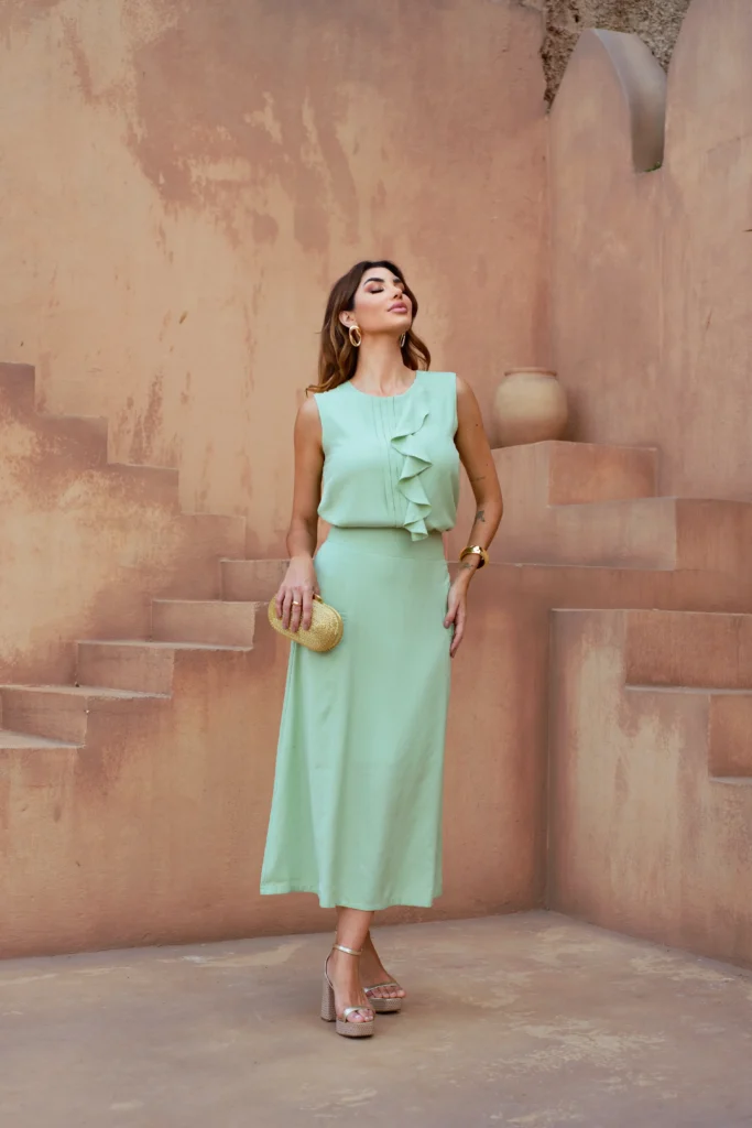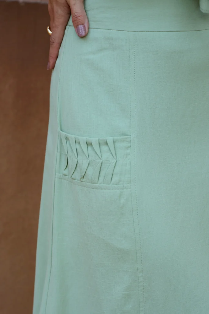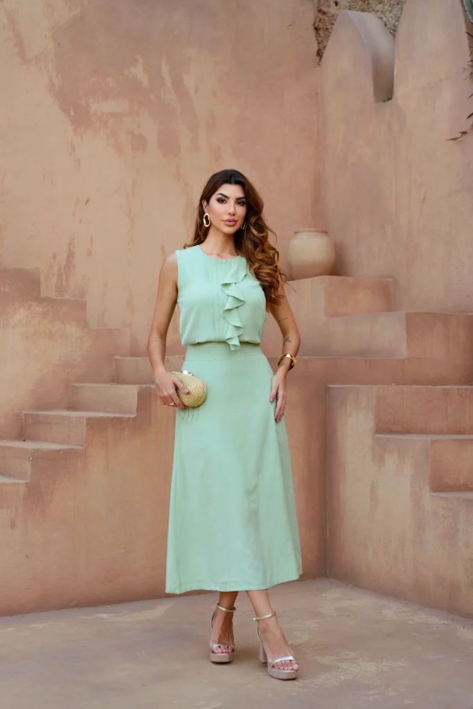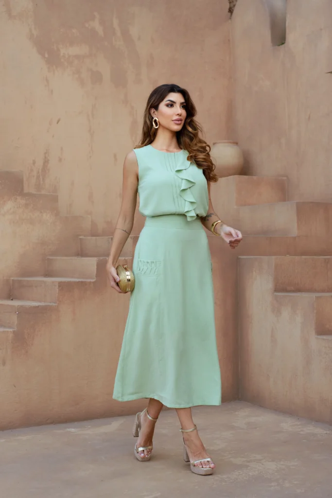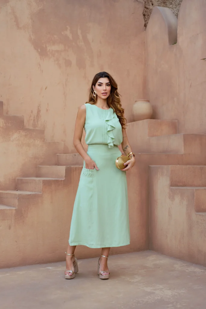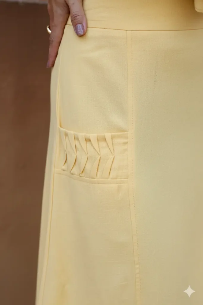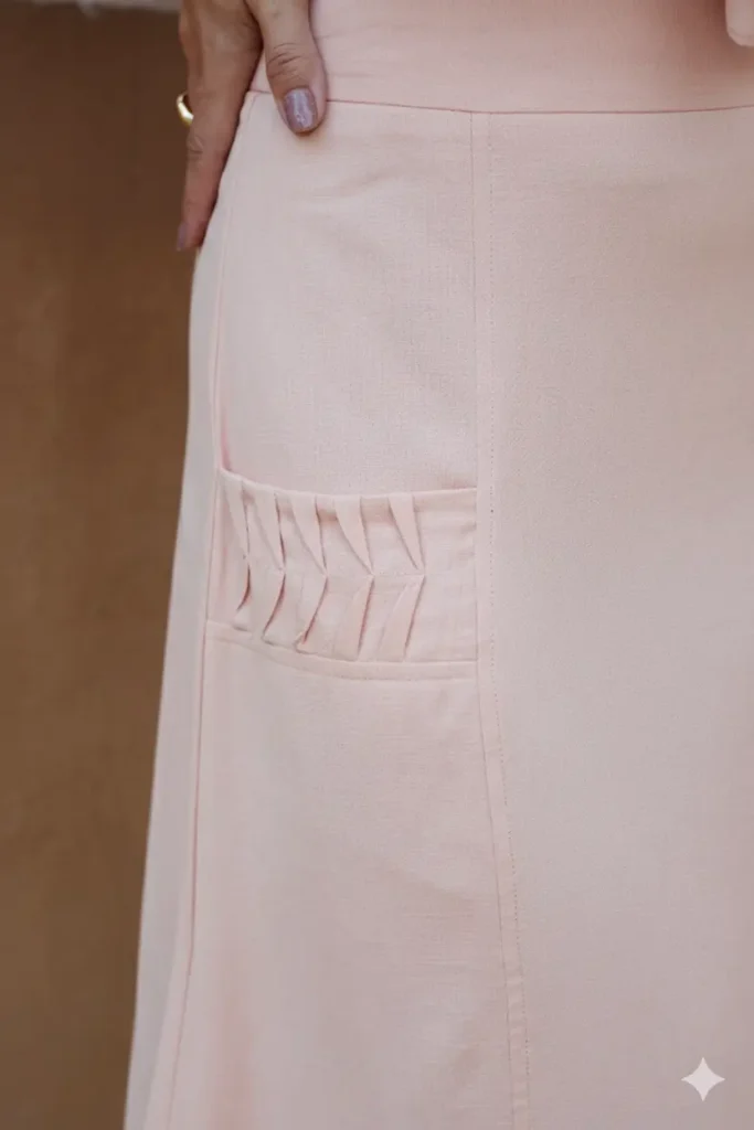 Os detalhes sutis nas laterais dão um charme extra, tornando-a uma peça única e especial. Em tons pastéis, esta saia é incrivelmente versátil, permitindo que você crie combinações deslumbrantes, desde o casual chic até os looks mais elegantes. Uma peça essencial para um guarda-roupa que valoriza estilo, conforto e versatilidade.